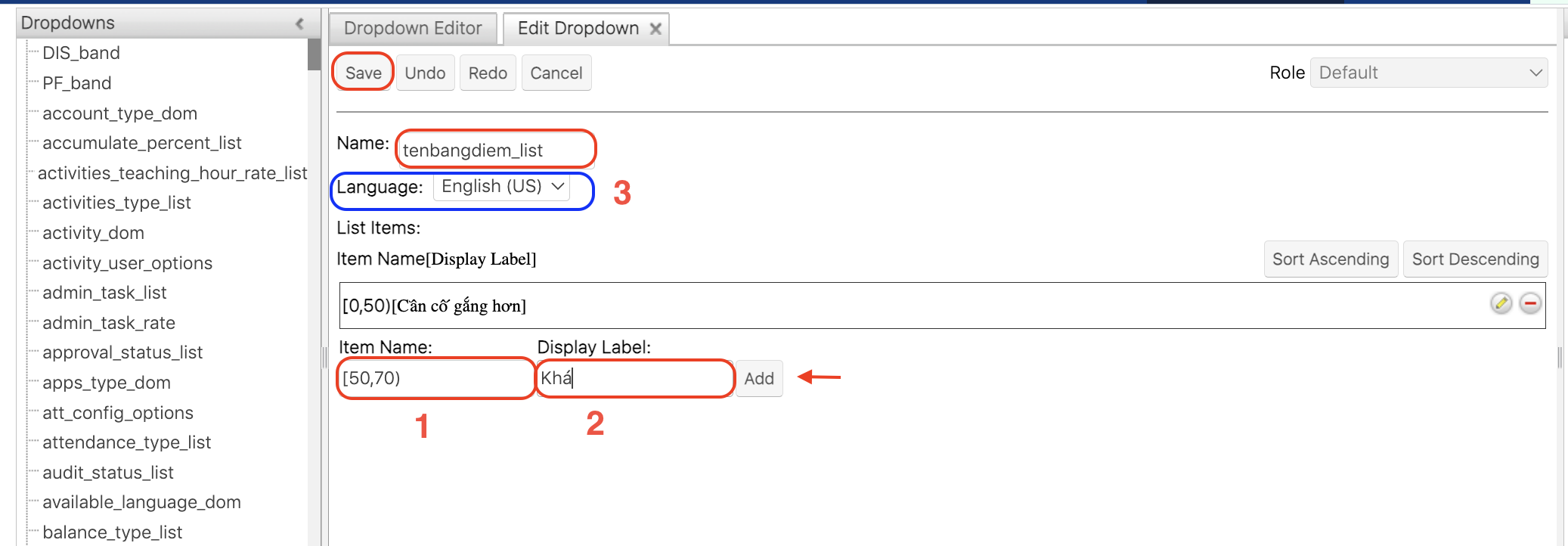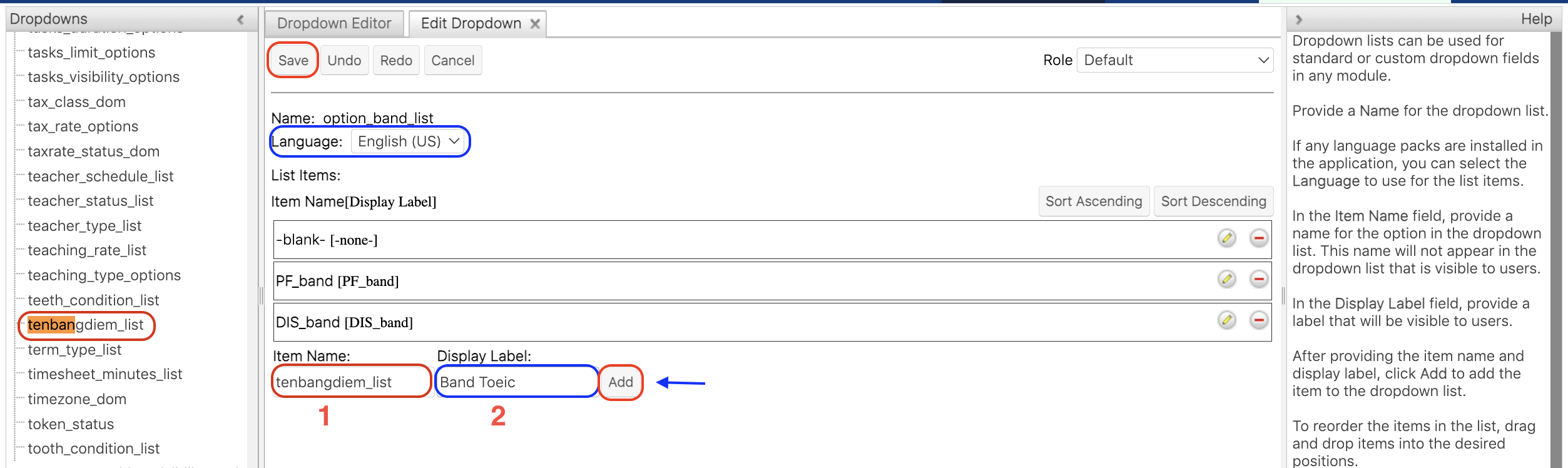 > **Bước 6**: Tại màn hình Dropdown option\_band\_list, người dùng nhập tên bảng điểm đã đặt vào item name, lưu ý là copy đúng với tên bảng điểm đã đặt. Cuối cùng bấm Lưu/Save.