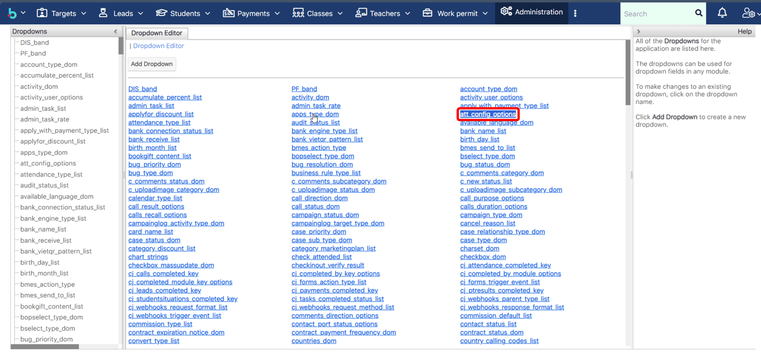 > **Bước 3**: Tại màn hình chi tiết Dropdown, lựa chọn mục "**att\_config\_options".**