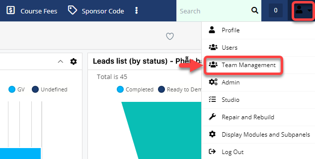 Tại avatar người dùng, bấm chuột vào **Team Management** để mở ra màn hình **Team Management**.