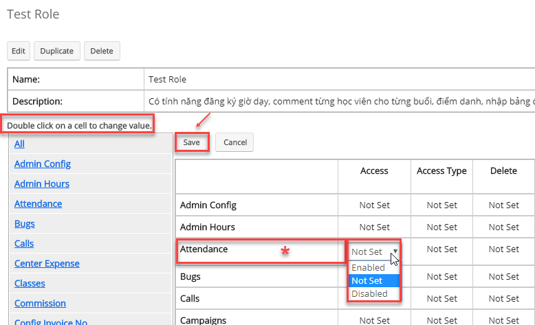 Double click vào từng module để Disable/Enable/Not Set/… cấp quyền truy cập/Edit/Import,… cho Role vừa tạo. Sau khi set quyền cho các module, nhấn Save để lưu lại.