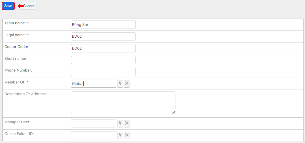 Sau khi đã nhập thông tin chi tiết của chi nhánh vừa tạo thì chúng ta tiến hành chọn **"Save"** để lưu lại.