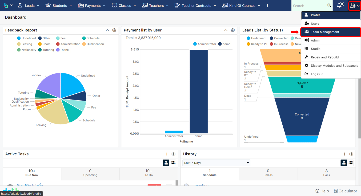 Tại avatar người dùng, bấm chuột vào **Admin** và chọn **Team Management.**